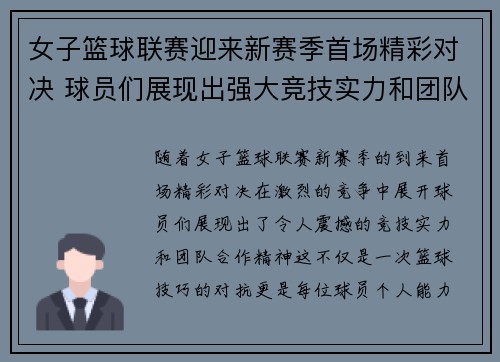 随着女子篮球联赛新赛季的到来,首场精彩对决在激烈的竞争中展开,球员们展现出了令人震撼的竞技实力和团队合作精神。这不仅是一次篮球技巧的对抗,更是每位球员个人能力与团队默契的全面展现。在这个赛季的开幕战中...