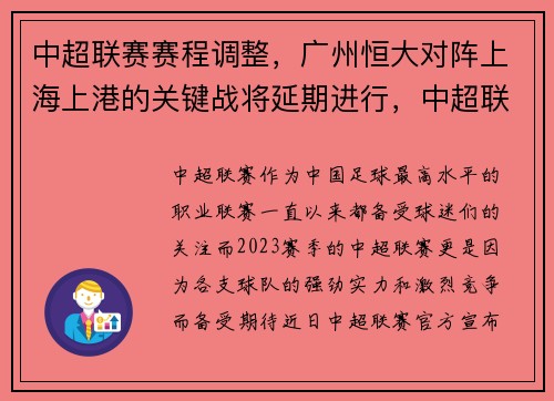 中超联赛作为中国足球最高水平的职业联赛,一直以来都备受球迷们的关注。而2023赛季的中超联赛,更是因为各支球队的强劲实力和激烈竞争而备受期待。近日中超联赛官方宣布了一项重要决定:广州恒大与上海上港的关...
